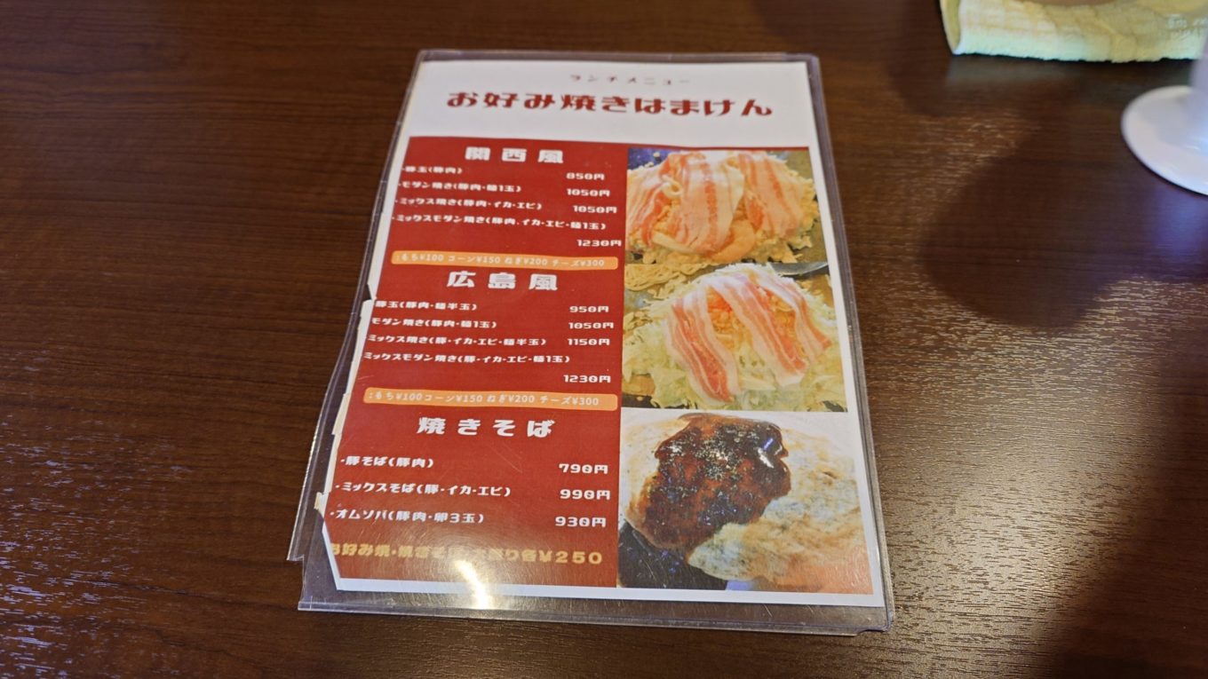 はまけんのランチメニューは、関西風お好み焼き、広島風お好み焼き、焼きそばなど種類が豊富。