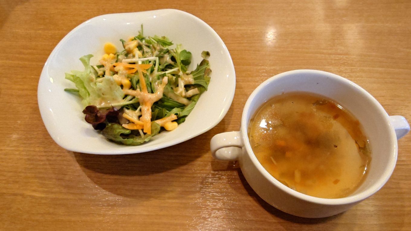 まず最初に運ばれてきたのは、前菜の野菜とスープ。