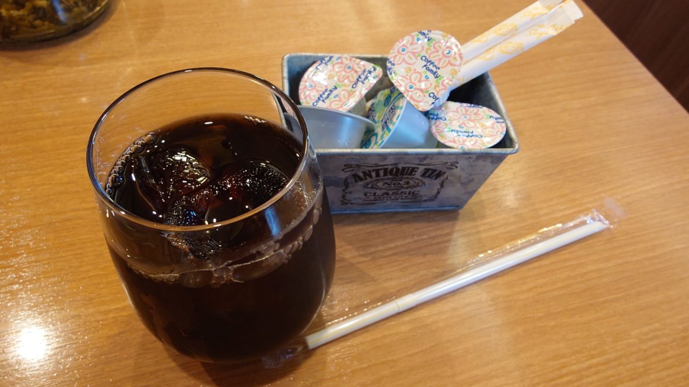 ジュースや烏龍茶など5種類ほど用意されており、今回はアイスコーヒーをいただきました。