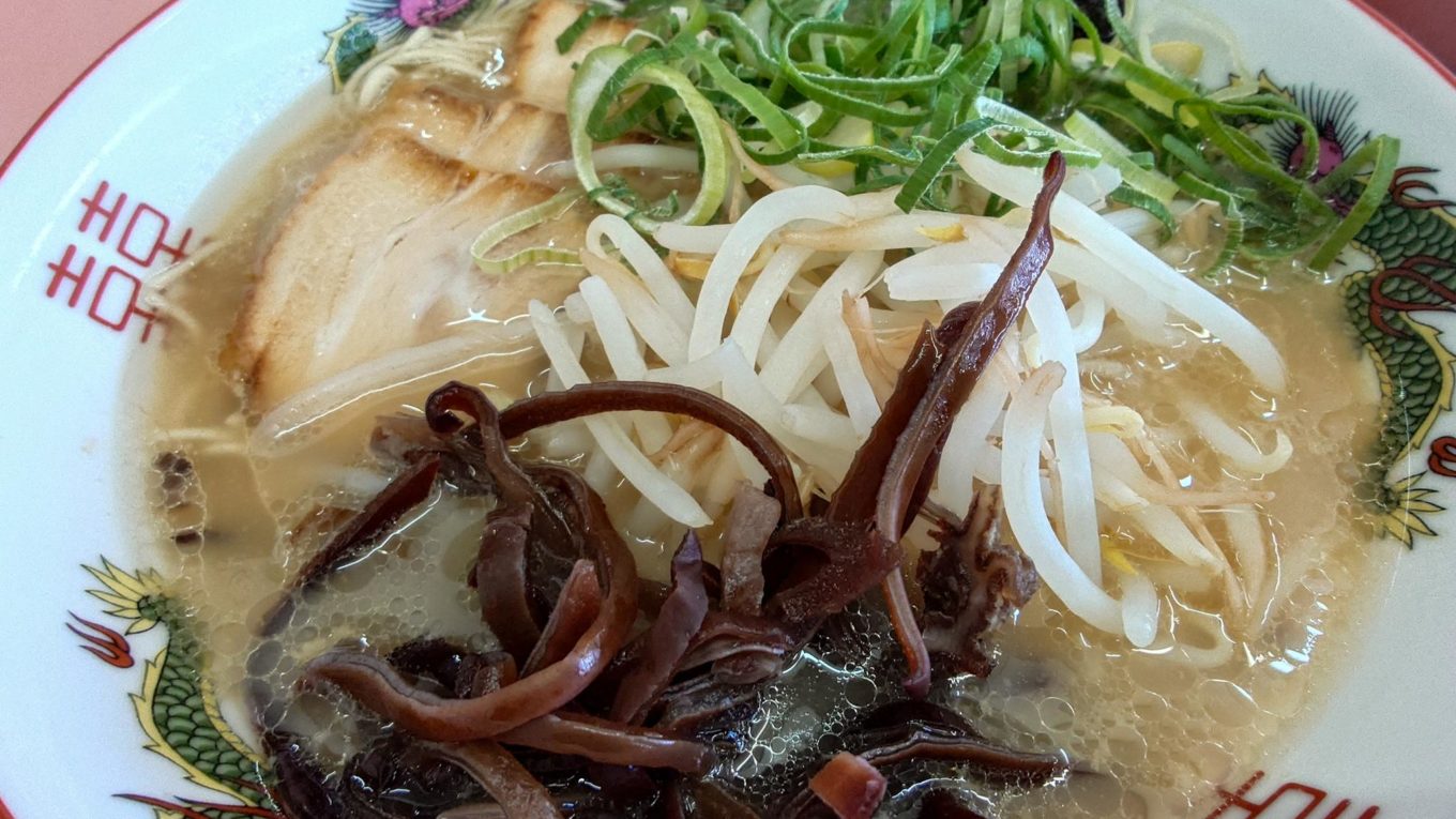 ベースとなるラーメンにもやしとキクラゲがトッピングされているのが特徴です。