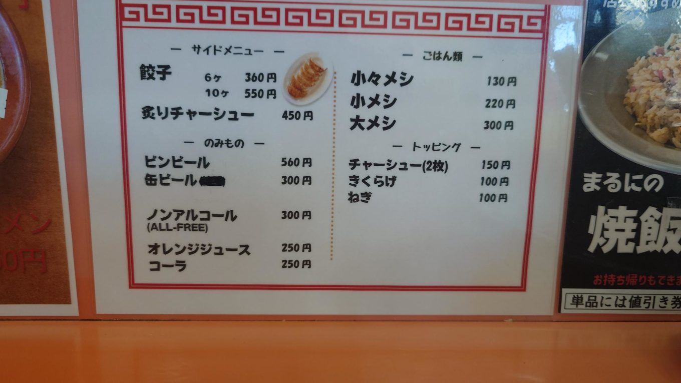 まるにラーメンでは、定番のラーメン類に加えて、焼き飯や餃子といったサイドメニューも用意されています。