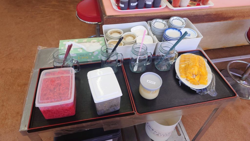 店内には、小皿・紅生姜・胡麻・ニンニク・沢庵を自由に取れるトッピングコーナーがあります。